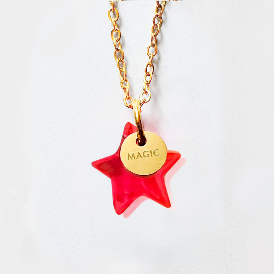 Handgefertigte Halskette aus Edelstahl 18K vergoldet mit Anhänger aus Acrylglas und vergoldetem, graviertem Plättchen