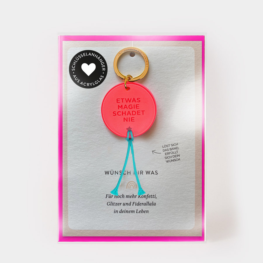 Dein persönlicher Glücksbringer: Schlüsselanhänger aus Acrylglas mit Wunschband. Löst sich das Band, geht der Wunsch in Erfüllung.