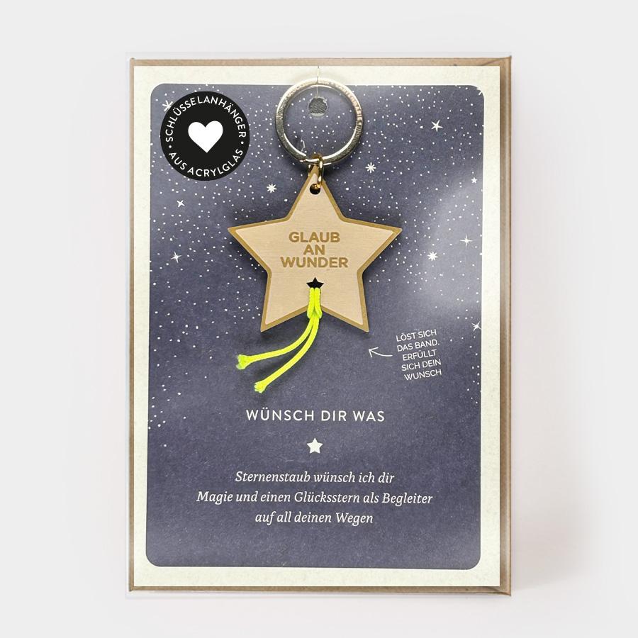 Dein persönlicher Glücksbringer: Schlüsselanhänger aus Acrylglas mit Wunschband. Löst sich das Band, geht der Wunsch in Erfüllung.